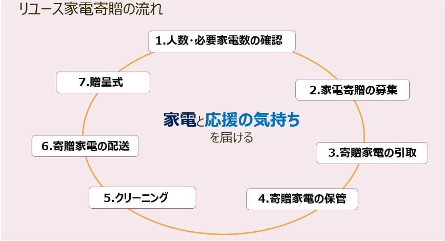 | 2. 家電寄贈の募集 | 募集・受付は寄贈者の転勤・転居・卒業・結婚などが多い時期を考慮しながら1年中行う 町内会や地域団体を通して募集ルートを確立 1人暮らし用サイズで製造後10年未満、送られた人が喜んで使える状態のものを募集 受付(引取の調整や寄贈候補品の確認)はメールで |