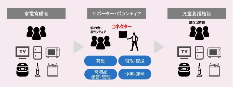 コネクターは児童養護施設と連携を取りながら地域の家電寄贈者・協力者・ボランティア等をつなげ、力を束ねる役割です