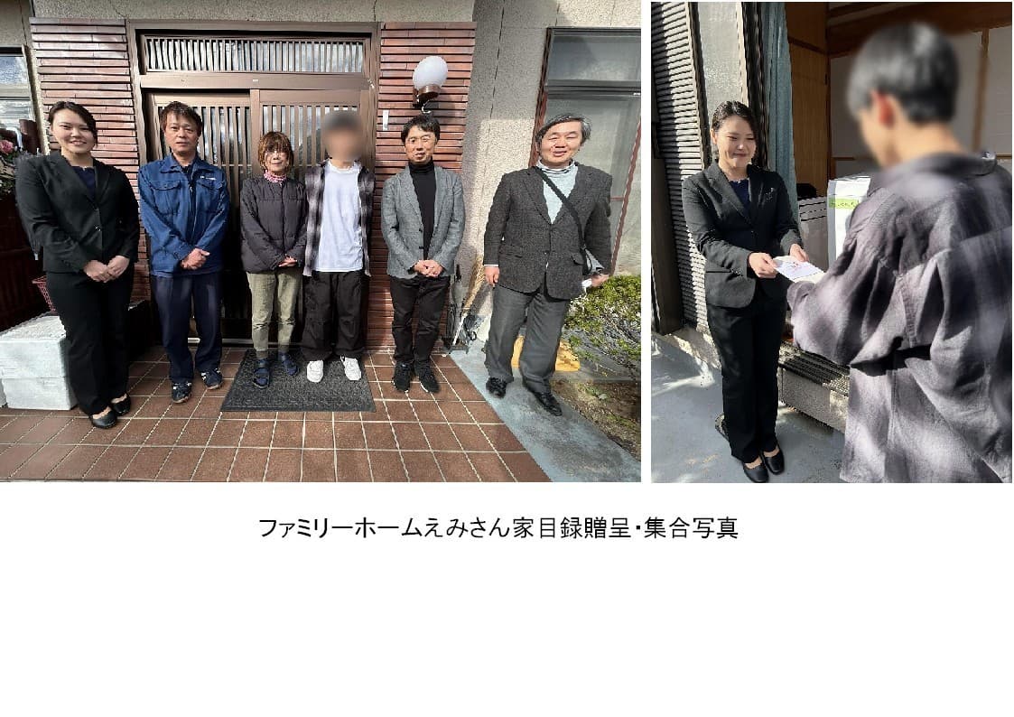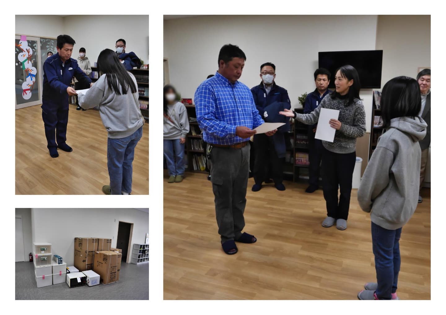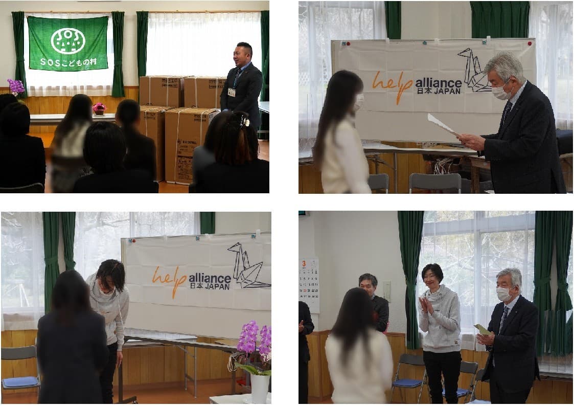 お祝いのことば(佐々木施設長)・目録贈呈・巣立っていく若者からの一言
